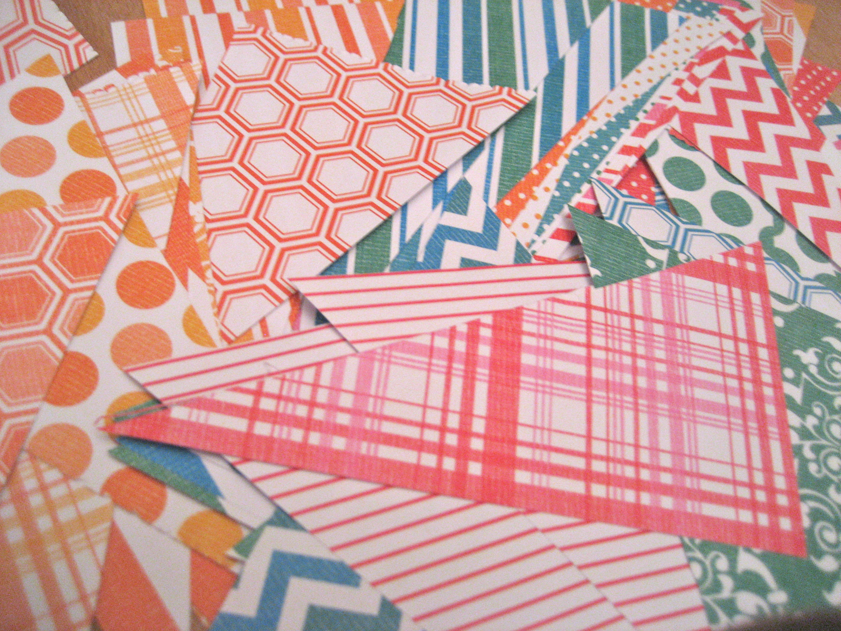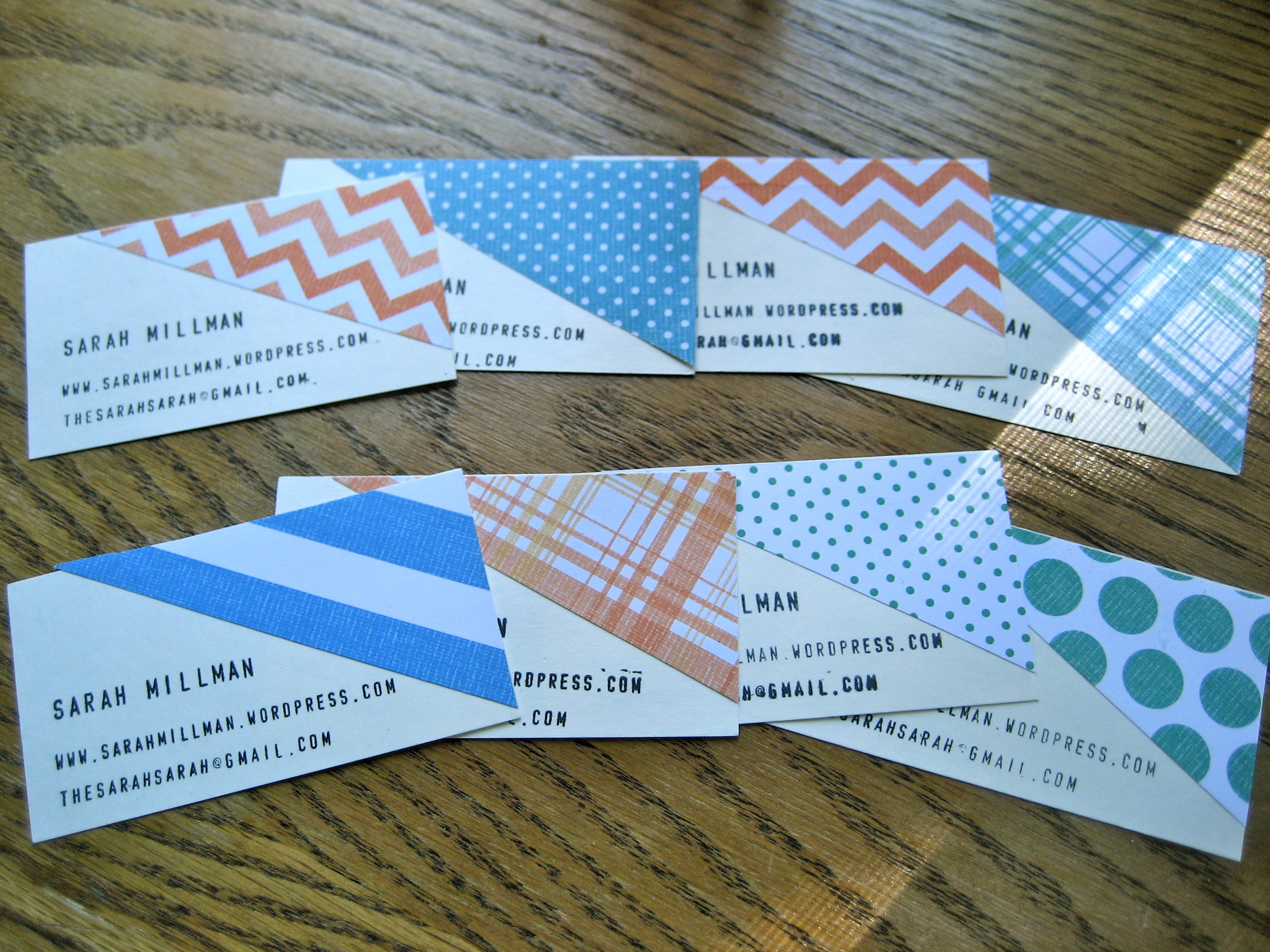 Add your embellishments. I originally planned to stitch across the tops of them with my sewing machine. As I was picking out thread colors, these scraps of paper caught my eye. They were leftover from my sister and brother-in-law’s baby shower decorations. I glued the triangles onto my business cards and then cut off the extra.
