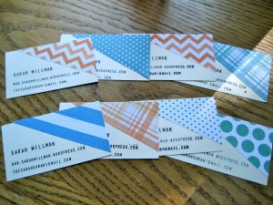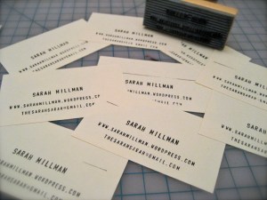 Inspired by Design*Sponge’s Amy Merrick, who made stamped business cards on manila shopping tags. I wanted something a little more uniform sized and colorful. Here’s how I made mine: