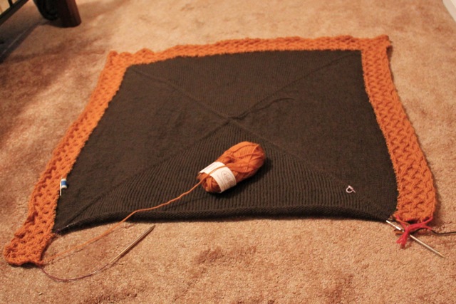 My goal is to finish the orange border and cast on the next chocolate brown border this week. So far I have three out of ten repeats done on the last side of the orange border. I got a major boost of encouragement from seeing Alana and Rebecca at their wedding shower/party last night. They’re so excited about their chuppah that it rubbed off on me too!