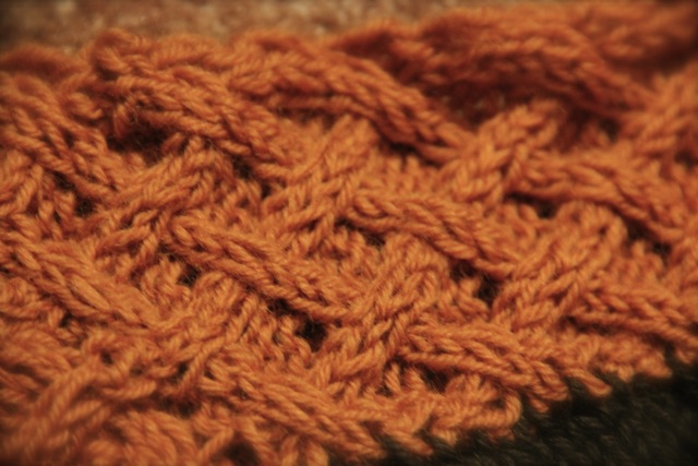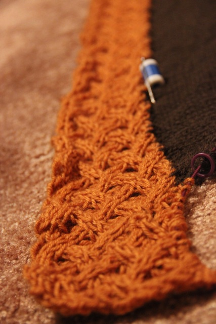 Speaking of cabling, I lost my cable needle in R&T’s couch. I’ve done the last 10 repeats without it, and I think my knitting time has improved due to that.