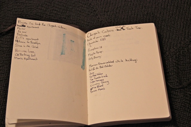I was inspired by Austin Kleon’s Get Yourself A Calendar post. Everytime I finish a ball of yarn, I got to mark it down. Then I realized that I was taking the Chuppah-Cabra everywhere with me, so I decided to keep track of that too. Favorite place so far? The 4 train from Woodlawn to Brooklyn. Cabling on a jostling subway train is quite challenging. I gave up trying to knit once we had to stand.