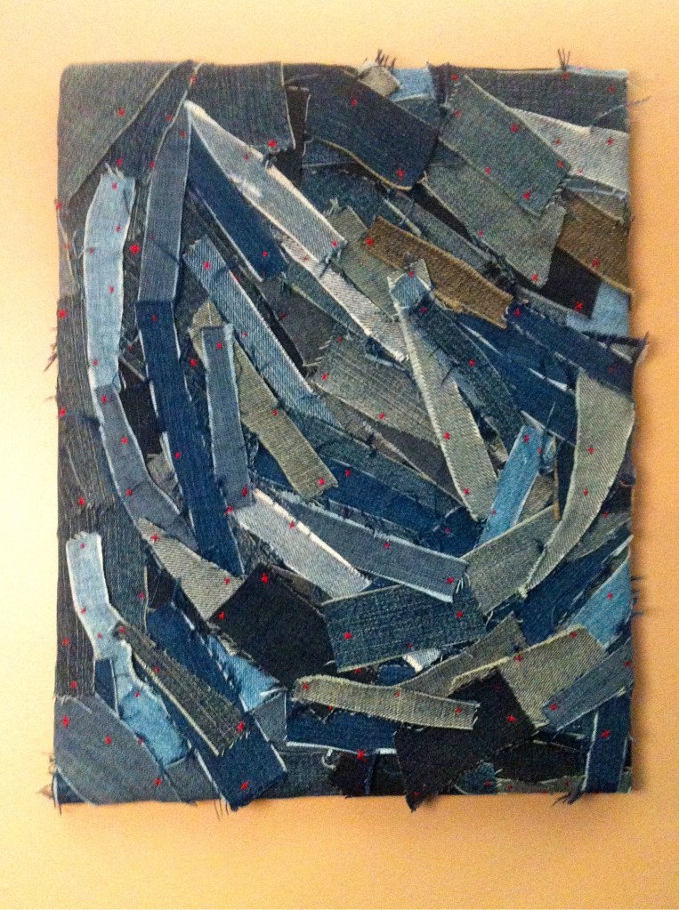 After a mad one-month rush to create new works reflecting the quote “We are symbols and inhabit symbols,” I’m thrilled to announce the gallery opening. Inspired by Japanese boro (patched clothing), folk quilts, and those jeans that I’ll never throw out, I’ve created several works made entirely from worn denim and embroidery thread.