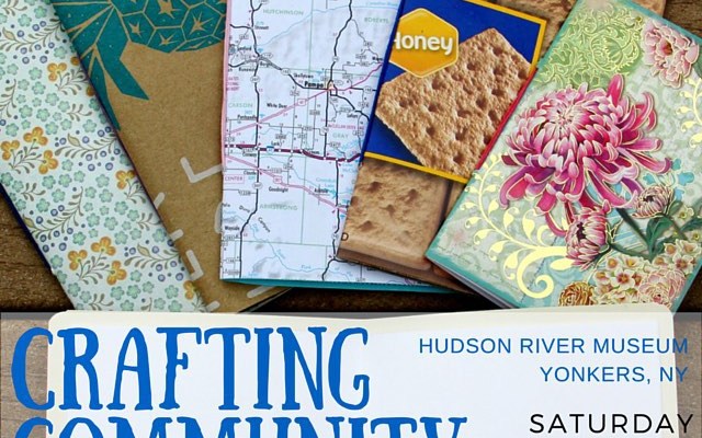 This Saturday, learn to repurpose common household items into clever little notebooks at my next Crafting Community class. The mini journals pictured here are made from: scrapbooking paper, brown paper bag, a map of Texas and envelopes, graham cracker box, a greeting card, and gift wrap (lying open). Just think
